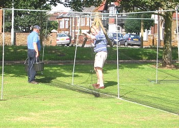 Chris leaves putting up the nets and surrounds to lend a hand to two ladies who are in just a little spot of bother putting up their awning. |